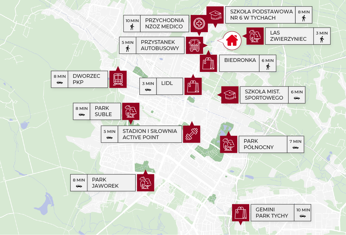 Osiedle znajduje się przy ul. Grabowej w tyskiej dzielnicy Zwierzyniec. Ważnym atutem tej lokalizacji jest swobodny dostęp do kluczowych ciągów komunikacyjnych oraz transportu publicznego, dzięki czemu można wygodnie podróżować po całym regionie. W 10 minut do ścisłego centrum Tychów i zaledwie kilka minut więcej do Katowic, Mysłowic, Mikołowa czy Pszczyny – tyle zajmie dojazd samochodem. Dzięki takiemu położeniu bez przeszkód mogą Państwo skorzystać z szerokiej oferty handlowo-usługowej, dotrzeć bez problemu do pracy lub szkoły, zorganizować weekendowy wypoczynek, czy też wziąć udział w wielu ciekawych wydarzeniach.