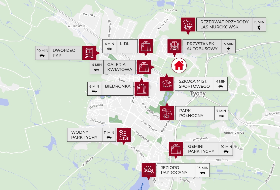 Inwestycja znajduje się w Tychach przy ul. Kaczeniec. To spokojna, dobrze skomunikowana okolica z której w kilka minut dojedziesz do samego serca miasta i wielu przydatnych na co dzień lokalizacji. Podróżowanie po całym regionie ułatwi Ci szybki wyjazd na drogę krajową nr 44, łączącą się z innymi kluczowymi trasami. Szybko dotrzesz również m.in. do centrum handlowego, obiektów sportowych czy parku wodnego.