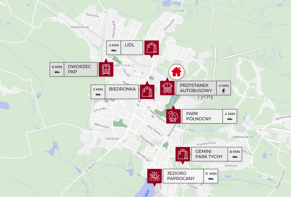 Lawendowa II to miejsce, w którym możesz odpocząć po pracy w naturalnym otoczeniu i prowadzić zdrowy, aktywny tryb życia. W zasięgu krótkiego spaceru lub rowerowej wycieczki znajduje się m.in.: Park Północny z placem zabaw i zbiornikami wodnymi, rozległy las w dzielnicy Zwierzyniec, czy Stadion Miejski w Tychach z infrastrukturą sportową. Niedaleko również Park Wodny i Jezioro Paprocańskie. Okolica zapewni Ci także codzienną wygodę – szybko zrobisz zakupy, skorzystasz z wielu usług i załatwisz wszystkie pilne sprawy.
