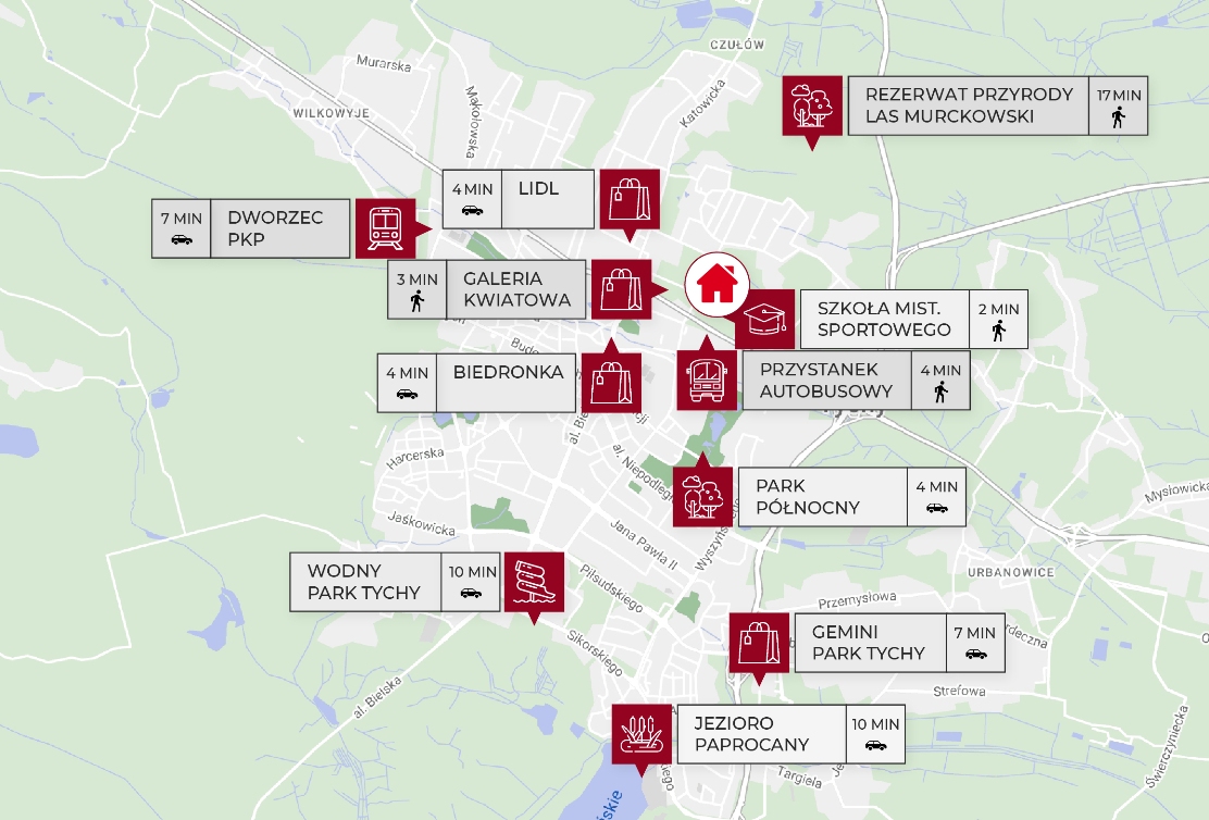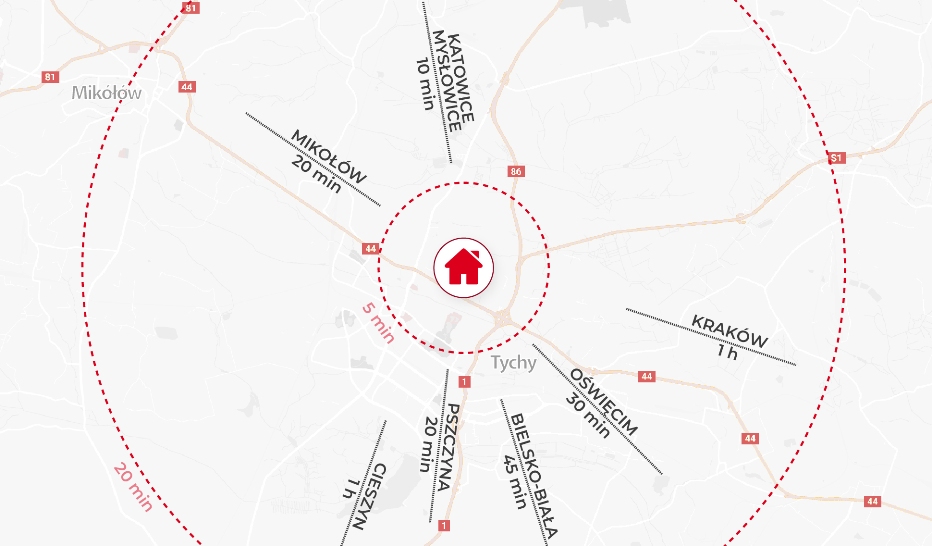 Lawendowa III to lokalizacja, która daje Ci więcej niż tylko spokój – daje Ci wolność. Dzięki świetnemu położeniu szybko dostaniesz się do centrum Tychów, na trasę S1 i DK44, a stąd już prosta droga do Katowic, Oświęcimia czy Bielska-Białej. Korzystasz z komunikacji miejskiej? W pobliżu masz przystanki, a także nowoczesne centrum przesiadkowe PKP. Zyskujesz czas, który możesz przeznaczyć na to, co naprawdę ważne.