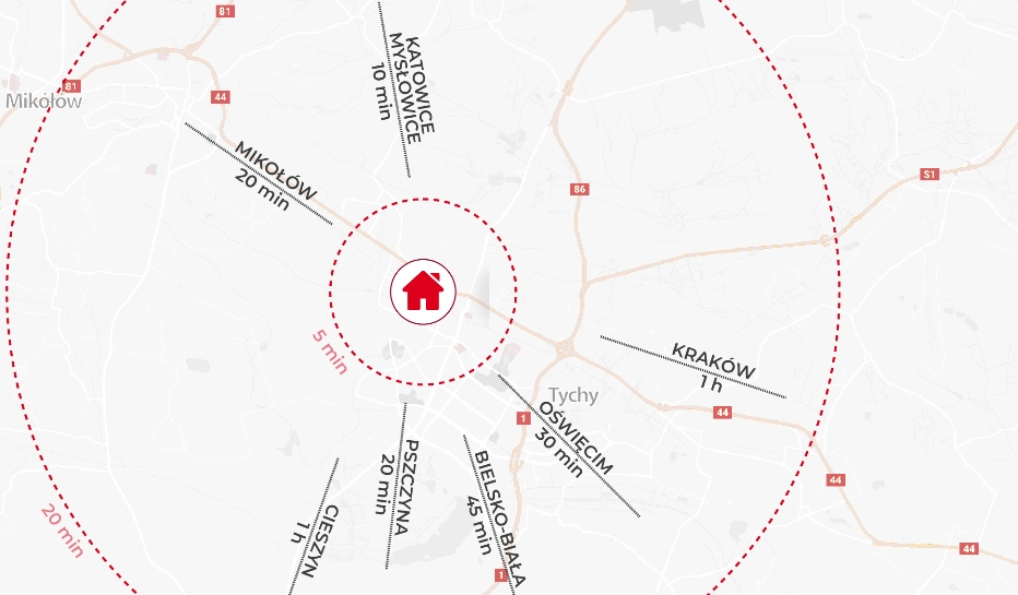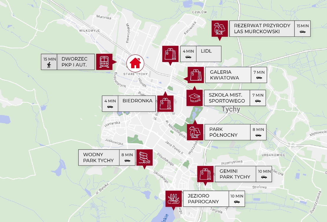 Nowokościelna w Tychach to idealne miejsce, jeśli chcesz mieć komfortowy dostęp do wszystkiego, co ważne – zarówno na co dzień, jak i od święta. Bliskość trasy DK44 pozwala szybko dotrzeć do Katowic, Mikołowa, Oświęcimia czy Rudy Śląskiej. Zaledwie 15 minut spacerem będzie dzielić Cię od dworca PKP i autobusowego, skąd wygodnie ruszysz w dalszą podróż – do pracy, na uczelnię czy weekendowy wypad. W okolicy nie brakuje też miejsc do aktywnego wypoczynku, spacerów i spotkań z bliskimi. Wybierasz pracę w mieście, a życie w zielonym otoczeniu? Tu to możliwe.