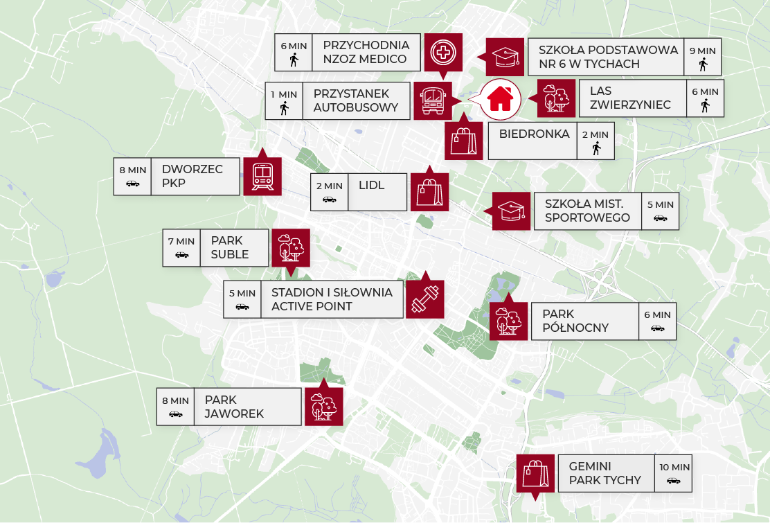 Osiedle zlokalizowane jest w Tychach przy ul. Zwierzynieckiej – w cichej, spokojnej okolicy, której jednym z najważniejszych atutów jest doskonałe skomunikowanie z całym regionem. Dzięki położeniu niedaleko drogi krajowej nr 44 i nr 86, węzła Wartogłowiec, a także drogi ekspresowej S1 można bezproblemowo i szybko dotrzeć samochodem do najważniejszych punktów w Tychach, do centrum Katowic, Mysłowic, Mikołowa, Pszczyny, Oświęcimia, a nawet Krakowa. Wygodnie można także korzystać z komunikacji miejskiej – w odległości 200 metrów od inwestycji znajduje się przystanek autobusowy, z którego kilka linii kursuje w kierunku śródmieścia.